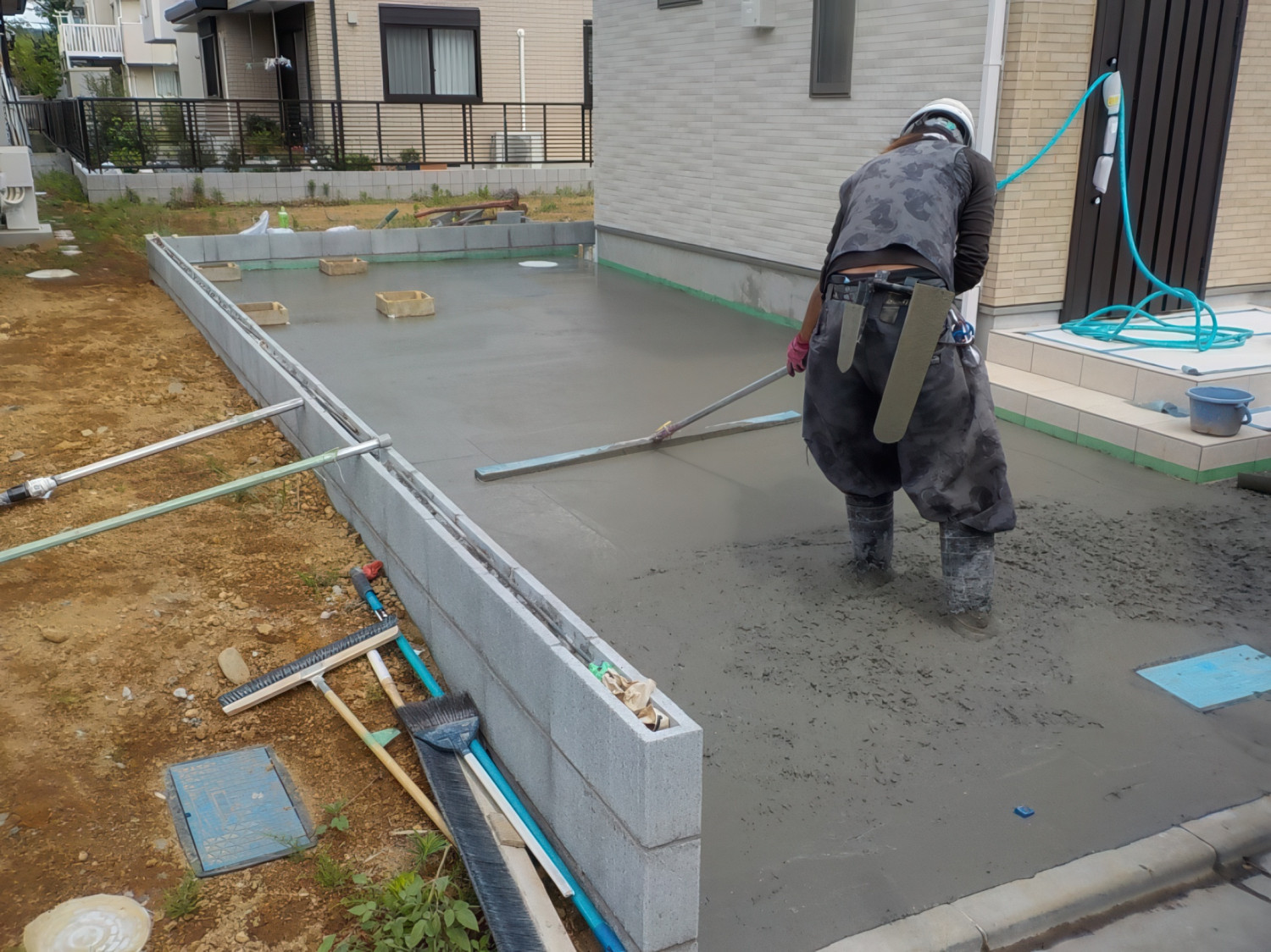 ポンプ車、生コン車手配するもので、最後に打込んだ土間を均して仕上げました。