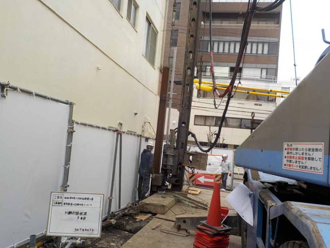 東京都葛飾区での新築マンション建設工事に伴う山留めH鋼打設工事です。
